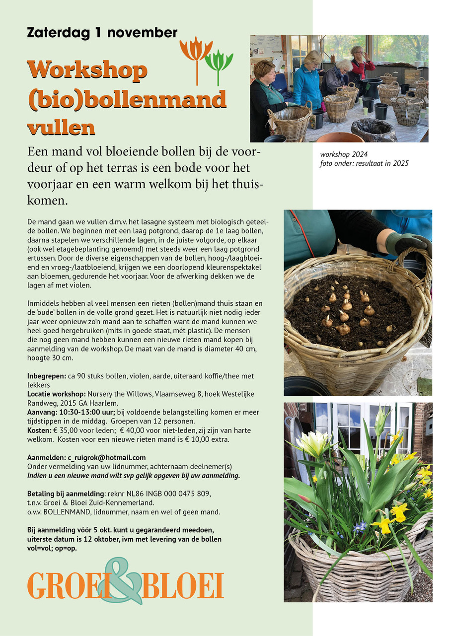 Inmiddels hebben al veel mensen een rieten (bollen)mand thuis staan en de ‘oude’ bollen in de volle grond gezet. Het is natuurlijk niet nodig ieder jaar weer opnieuw zo’n mand aan te schaffen want de mand kunnen we heel goed hergebruiken (mits in goede staat, mét plastic). De mensen die nog geen mand hebben kunnen een nieuwe rieten mand kopen bij aanmelding van de workshop. De maat van de mand is diameter 40 cm, hoogte 30 cm.