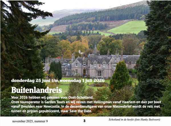 Onze touroperator is Garden Tours en wij reizen met Hellingman vanaf Haarlem en dan per boot vanaf IJmuiden naar Newcastle. In de decemberuitgave van onze Nieuwsbrief wordt de reis met tuinen en prijzen gepubliceerd, maar Save the Date.