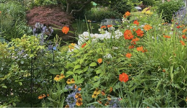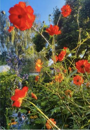 Dat schilderstalent op doek heb ik helaas niet geërfd. Ik beperk mij tot “schilderen met bloemen” in de tuin. Mijn werkwijze is organisch. Een vastomlijnd plan is er niet, wel een soort voorstelling in mijn hoofd. Welke kleuren zouden het komende seizoen kunnen worden toegevoegd aan de vaste beplanting door het gebruik van fleurige eenjarigen? Welke planten waren tevreden op hun plek en welke totaal niet? Tuinieren is elk jaar weer een proces van observeren, vallen, opstaan en.... weer vrolijk doorgaan.
