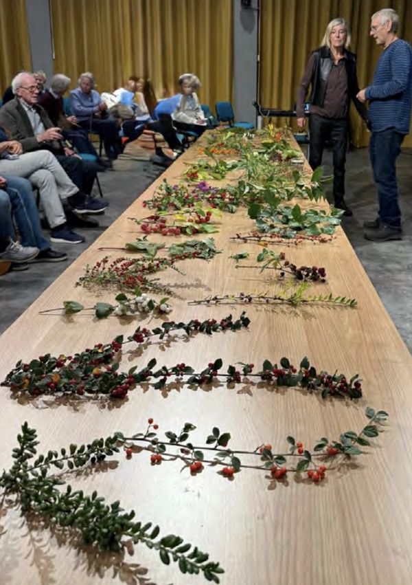 De presentatie van Frans was uiterst interactief te noemen, iedereen werd betrokken bij het benoemen van de wel 50 soorten plantentakken met bessen die hij had meegenomen. Naast de heel populaire rode bessen, waren er ook witte, zwarte, blauwe, gele en oranje bessen. Enkele kenners onder ons konden de meesten benoemen, echter er bleven toch een paar mysterieuze takken over. Het was een genoeglijke, leerzame avond. We zullen weer op een andere manier naar deze planten en struiken kijken, want juist in de herfst en winter als de meeste planten eventjes wegkwijnen zijn deze vrolijk gekleurde bessen een mooie blikvanger in de tuin! Én last but not least: de vogels hebben wat extra’s!